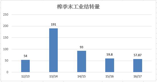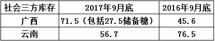 16/17榨季中糖協統計9月工業結轉57.87萬噸,同比減少1.9萬噸,從分省統計的工業結轉量看16/17榨季工業結轉100萬噸左右,7—9月份全國銷量數據官方統計均有所修正,所以對比同期工業庫存結轉量的意義有所失效。廣西工業結轉47.5萬噸,云南工業結轉35.9萬噸,二大主要產區工業結轉合計83.4萬噸。那么除了產區工業結轉量之外,產區第三方庫存數量有多少?后期假如12月才開榨的話,四季度產區供應是否偏緊從而導致四季度會繼續放儲。