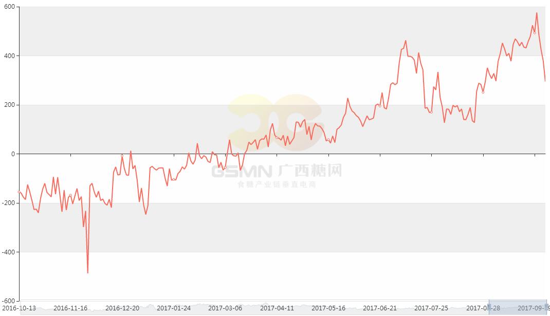 從筆者了解的9月底廣西、云南第三方庫存數據看,廣西9月底第三方庫存71.5萬噸,假如剔除27.5萬噸的儲備糖庫存量9月底廣西第三方庫存為44萬噸,同比減少1.6萬噸。云南的第三方庫存同比減少19.8萬噸,主要還是打擊走私力度成效顯著。由于第三方庫存有部分是已售庫存未出庫的部分,所以有一定的庫存重疊。筆者大概剔除了重疊的部分預計9月底廣西、云南工業+社會第三方庫存分別71.5萬噸(不包括27.5儲備糖)、65.9萬噸左右,合計產區可以流通的庫存大概137萬噸左右。由于廣西推遲開榨除了個別糖廠特例之外絕大多數糖廠都是12月份開榨,那么產區的工業和社會第三方庫存結轉是否能夠滿足新糖上市之前的市場需求。