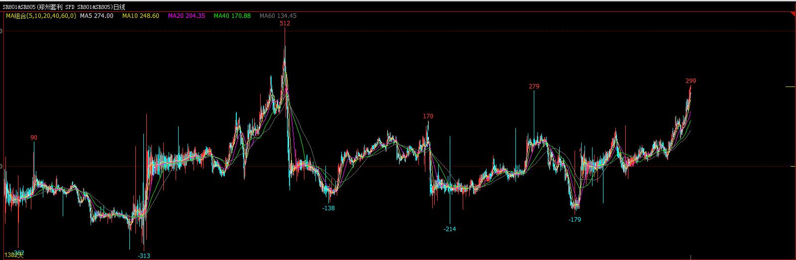 傳SR1801合約可能還有多頭軟逼倉,產區開榨時間猜想、后期的產量供應進度、春節采購、走私等系列多空故事交織,所以SR1801合約難以形成有效單邊走勢,SR1805合約基本面相對清晰,增產預期和進口量相對寬松熊市格局難改,SR1-5主流趨勢正套為主。近期SR1-5價差最高走強至313,歷史SR1-5基差最高達到512。
