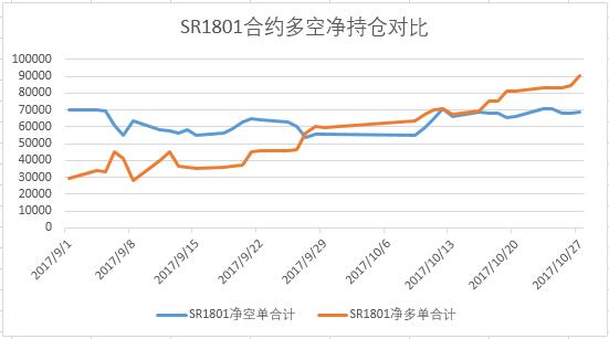 SR1801合約凈空單主要是光大期貨、五礦經易期貨、中糧期貨凈空單合計,凈多單主要是華信期貨、國海良時、招商期貨為主。多空合計的持倉頭寸看,SR1801合約的上漲多頭不斷加倉追多為主,相反空頭持倉相對穩健并沒有因為SR1801合約上漲而止損出場。SR1801合約越上漲越面臨系列套保、投機頭寸的打壓可謂高處不勝寒。