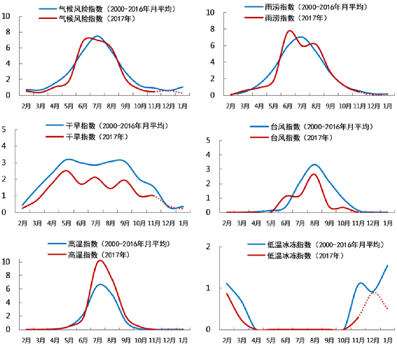 根據(jù)國家氣候中心的預(yù)計,今年冬季(2017年12月至2018年2月)全國平均氣溫較常年同期偏高,呈北方暖濕南方暖干的分布。東北北部、內(nèi)蒙古東部、新疆北部等地可能出現(xiàn)階段性強降溫、強降雪過程,南方地區(qū)發(fā)生大范圍、持續(xù)性低溫雨雪冰凍災(zāi)害的可能性較小。未來三個月,中國氣候風(fēng)險指數(shù)處于較低水平(預(yù)測值均低于1.0)。各分類災(zāi)害風(fēng)險也大都接近或低于歷史同期。