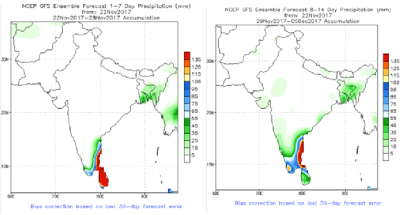據(jù)了解,印度2017/18榨季如預(yù)期較往年提早開榨。截至2017年11月15日,全國已有313家糖廠開榨,較去年同期的222家增加。本榨季前45天產(chǎn)糖137.3萬噸,去年為76.7萬噸。印度產(chǎn)區(qū)較好的天氣也是助力產(chǎn)區(qū)的開榨,并且從未來兩周的降雨分布圖來看,印度還是少雨為主,因此預(yù)計還是將有利于蔗區(qū)的開榨。