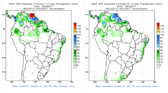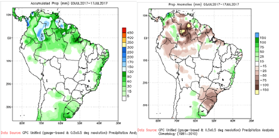 7月3日至17日巴西降雨分布圖與距平分布圖