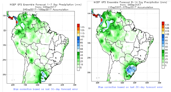 巴西中南部未來兩周降雨分布圖