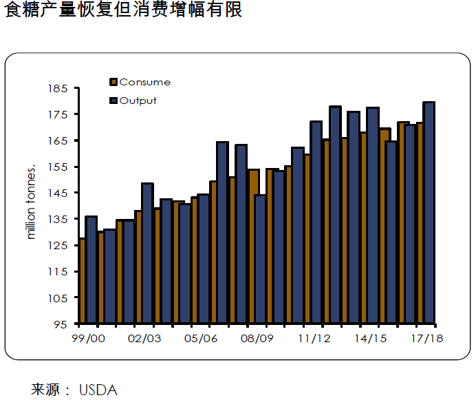 結果: 糖價下滑,不僅是因為好天氣給2017-18作物產量前景起了個好頭,而且今年供應缺口根本不足以構成廣泛短缺,而市場之前的沖高正是基于這種短缺的預期。高價還需高價醫。產量數據并不太差,同時食糖消費的增量有限,因此市場也不至于出現供應緊張。上個農事年食糖增產所帶來的庫存增加足以提供緩沖,因此進口商無需大幅提高采購規模。