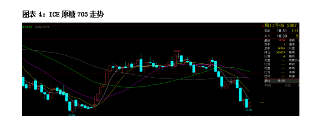 原糖本周依舊處于下行通道,保持弱勢。其中周二下跌接近4%,而周一和周四跌幅也在2%以上,我們認為原糖的下跌主要與基金多頭平倉有關(guān)。本周原糖累計下跌1.29美分,跌幅達到6.58%。
