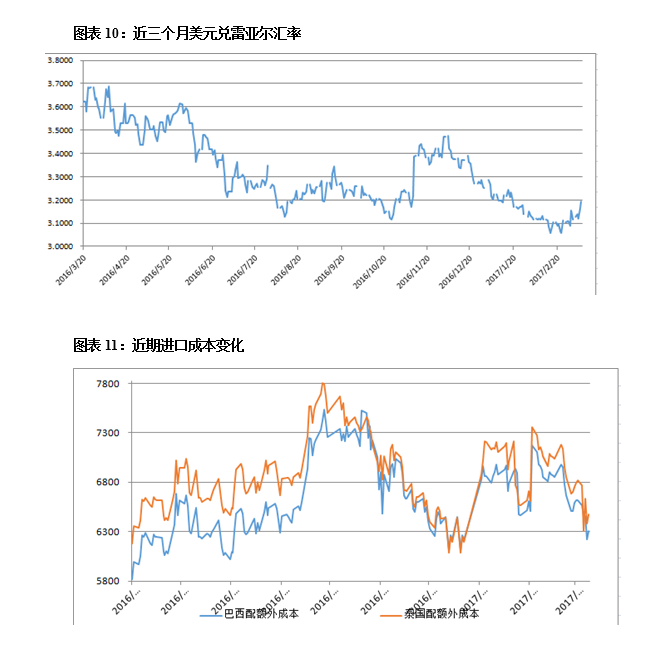第二點是今年的整體供需格局,國產(chǎn)量僅900萬噸出頭,正規(guī)與非正規(guī)進口總量預(yù)計400萬噸,仍有150萬噸的缺口需要國儲填平。熊市年份的一般路徑是國產(chǎn)加進口對于需求來說已經(jīng)過剩,因此,2017年直接轉(zhuǎn)為熊市下跌的判斷值得商榷,或許仍是一個不知道何時拐點的鑄頂年份。如果國內(nèi)外市場全部如預(yù)期般在17-18年大幅增產(chǎn),那么未來糖價可能逐漸走弱,但這也需要一個過程,往往預(yù)期容易打過頭,而對于遠期的增產(chǎn)預(yù)期,市場參與者早早已經(jīng)看到。另外,有一個不合理的價差存在,1709對1801合約處于貼水狀態(tài),且1801升水超過200點,若預(yù)期1718榨季大幅增產(chǎn)且國內(nèi)糖價回落,那么1801合約當前所處的高位就非常不合理,而市場能出現(xiàn)這一價差,意味著遠期還沒有到悲觀的時候。我們可以參考12年之后的熊市路徑,遠月合約一直是貼水往下打的狀態(tài)。