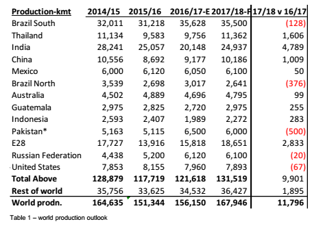 預(yù)計17/18年度全球產(chǎn)量增幅將接近1200萬噸的記錄高點(前一次高點出現(xiàn)在14/15年度)。