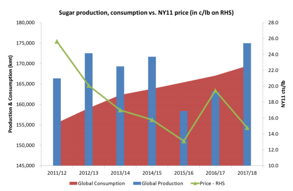 17/18年度全球糖市預(yù)計出現(xiàn)約550萬噸過剩,隨著產(chǎn)量可能出現(xiàn)進一步增加,過剩量有可能增加至650萬噸。
