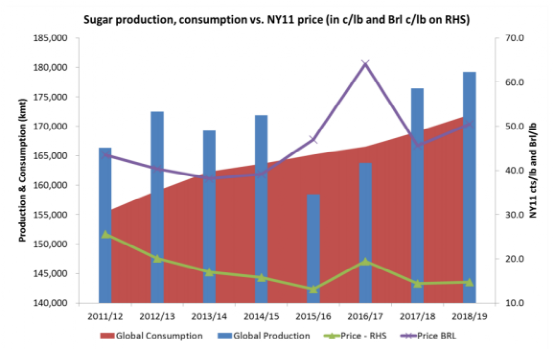 由于17/18年度增產強勁,將出現全球性的供應過剩,然而亞洲地區的中國(排除國儲)和印度供應較緊。不過,由于上述地區市場價格較高,而歐盟/黑海地區試圖擴大供給,18/19年度的供應量預計與17/18年度相似,或者更甚。全球食糖消費增長約為300萬噸/年,18/19年度看來又是過剩的一季。