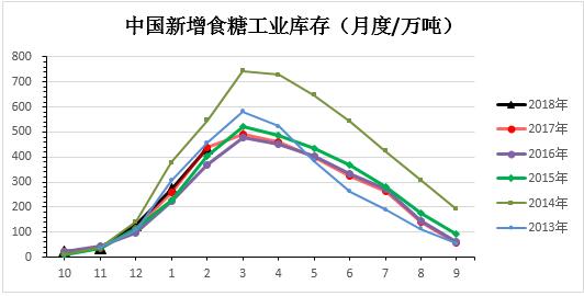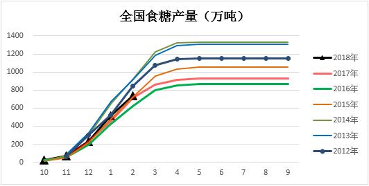 國際方面亞洲地區印度和泰國的產量超出預期并逐步兌現,隨著亞洲壓榨進入尾聲,本年度過剩預估基本板上釘釘,國際糖市仍然處于熊市周期。國內方面截止2018年2月,全國合計產糖736.69萬噸,同比增幅2.94%或21.02萬噸,考慮到今年新年在2月份,2月產量同比減少。隨著壓榨逐步進入尾聲,今年國內產量預計在1030萬噸左右,同比增幅預計在100萬噸上下。今天國內增產基本落實,糖價仍然處于熊市周期。