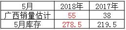 廣西5月現貨價格總體環比下跌70—100元/噸,5600元/噸附近現貨價格對于銷區貿易商有一定投資價值,銷區有一定采購補庫。盡管增產周期從統計社會第三方庫存量增量同比有限,銷區下游庫存始終薄弱。了解的銷量情況預計5月廣西銷量55萬噸左右,5月底工業庫存預計278萬噸,同比增加59萬噸。從廣西增產的量和工業庫存增量對比情況看,55萬噸左右單月銷量對于廣西銷量實屬利好,假如僅銷量40萬噸左右預計偏空。