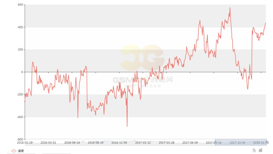鄭糖SR1805合約周下跌1.76%,跌破前低至5721低點。價格出乎意料的跳水,期現市場的價格漲跌差導致上周基差繼續走強。按照目前的現貨市場的供需情況看,現貨市場的供應量已經達到了產量供應最大化時間節點。統計廣西主要地區1月上旬的甘蔗歀兌付率同比偏低,集團糖廠的資金情況存在偏緊,尤其是春節采購季節備貨結束,現貨市場短期難以實現價格的穩定刺激銷區貿易商采購。1月份繼續維持價格低位運行為主。