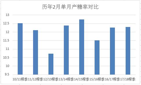 從統(tǒng)計(jì)對比的數(shù)據(jù)看,1-2月份廣西天氣和光照影響,2月單月產(chǎn)糖率同比基本持平,產(chǎn)糖率增幅有限。此外,春節(jié)糖廠開工率下降,產(chǎn)能利用率偏低也是影響因素之一。但是2月單月產(chǎn)糖率環(huán)比增加0.5%,主要是進(jìn)入2月甘蔗更加成熟和糖分基本穩(wěn)定刺激產(chǎn)糖率增加。