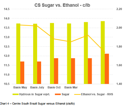 5月份中南部地區(qū)的壓榨節(jié)奏穩(wěn)定之后,乙醇與糖的價(jià)差將是判斷糖醇比變化的關(guān)鍵。