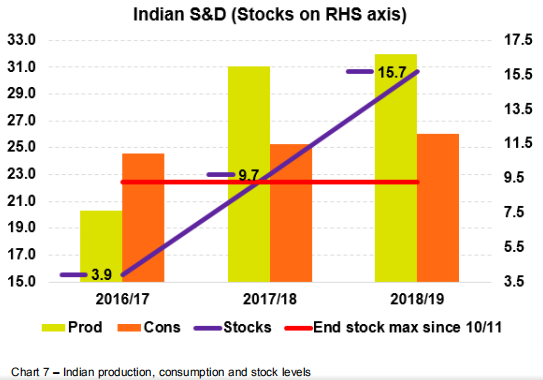 預(yù)計(jì)17/18 & 18/19兩個(gè)榨季的累計(jì)生產(chǎn)過(guò)剩量將達(dá)到2300萬(wàn)噸,完全抵消之前兩個(gè)榨季共計(jì)900萬(wàn)噸的缺口。