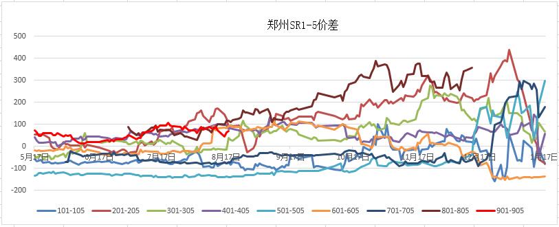 SR1-5價差對比周前期有所走強至69點,本周盤中最大價差達到77點,1819榨季甜菜生產成本和、注冊成本、產量進度未能明晰,SR1-5短期正反套趨勢不明顯。