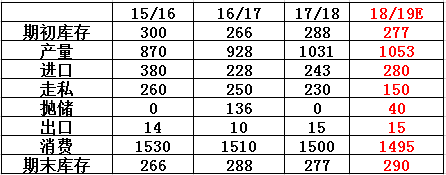 預計,2019年上半年進口120-130萬噸,同比減少8-18萬噸,2019年5月22日之后,稅率會有所調整,成本降低,進口量會有所增加,2019年預計進口320-350萬噸左右,18/19榨季預計進口280-300萬噸,同比增加37-57 萬噸,具體最終進口數(shù)據(jù)以官方統(tǒng)計數(shù)據(jù)為準。
