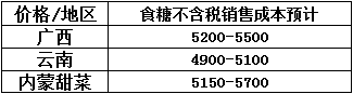 各主產(chǎn)區(qū)成本方面,按照廣西490元/噸的甘蔗收購價格測算,疊加人工、各項管理費用,預計廣西不同糖廠不含稅銷售成本大概在5200元/噸—5500元/噸左右。云南、內蒙方面,同理按照廣西不含稅成本計算方法云南、內蒙不含稅銷售成本分別大概在4900元/噸—5100元/噸,5150元/噸—5700元/噸。