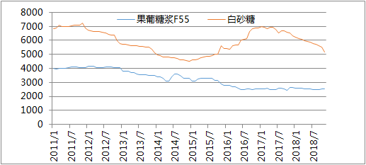 圖五:果葡糖漿和白砂糖價格走勢(元/噸)