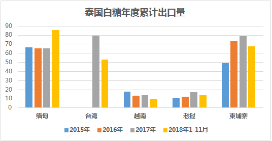 17/18榨季非渠道進口打擊力度加強,預計非渠道進口量同比減少,緬甸、臺灣、越南、老撾、柬埔寨繼續(xù)是非渠道進口的主要來源途徑。從以上東南亞國家進口泰國白糖(精致糖+低質量白糖)統(tǒng)計看2018年1-11月同比減少,尤其是下半年內外價差,配額外進口利潤關閉,非渠道進口數(shù)量環(huán)比下降。結合,泰國出口到東南亞國家數(shù)據(jù)和走私路線,包括云南相關口岸、沿海地區(qū)到周邊地區(qū)的輻射數(shù)量等大概預估17/18榨季非渠道進口預計200-230萬噸左右,同比略有減少。