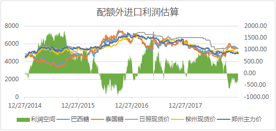 假如,按照廣西不含稅銷售成本作為未來現(xiàn)貨價格下方偏離的參考標準,目前價格已經(jīng)偏離,后期價格下方還有多大空間?筆者認為,可以依次參考不同糖源成本,分別是走私糖,配額內進口成本等作為價格偏離度的適當參考。