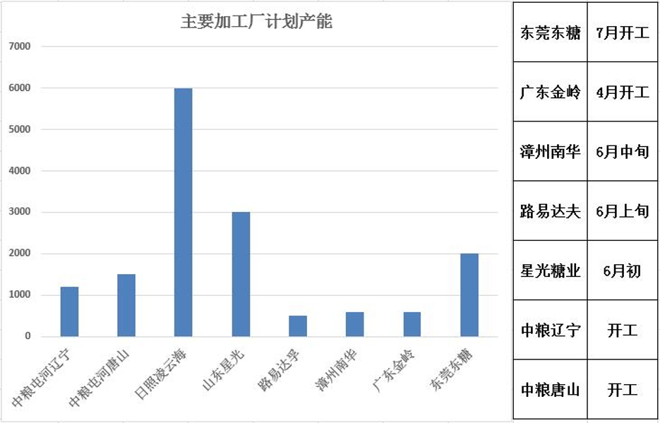 2018年5月底135萬噸配額外進口許可陸續全部發放,加工廠也在6月左右試機開工。國內加工廠計劃產能日照最大但目前開工時間不確定,所以,后期加工糖供應會集中來自中糧、金嶺、星光為主,漳州南華該廠加工的基本都是精制糖和碳法糖等高級糖源價格偏高和國產糖沒什么競爭力。根據最新加工廠計劃開工時間表和設計產能、6—8月份船期預計6—8月份國內市場至少累計供應80 — 100萬噸加工糖。