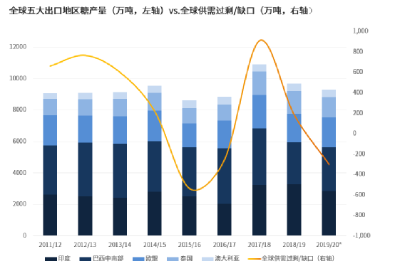 19/20榨季全球糖市預(yù)計(jì)將出現(xiàn)300萬(wàn)噸缺口(ISO數(shù)據(jù)),五大出口地區(qū)總產(chǎn)量預(yù)計(jì)同比下降約400萬(wàn)噸,至9296萬(wàn)噸。