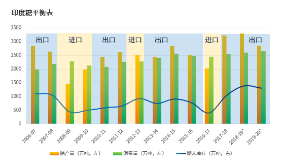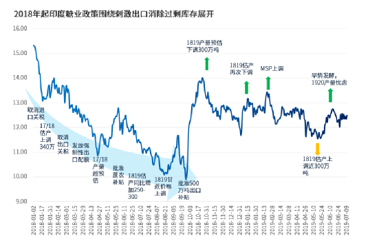 事實(shí)上,從另一個(gè)角度說(shuō),目前的估產(chǎn)準(zhǔn)確與否并不十分重要,印度糖廠協(xié)會(huì)(ISMA)每年的幾次產(chǎn)量預(yù)估常常出現(xiàn)非常大的變動(dòng),但每次大的估產(chǎn)調(diào)整導(dǎo)致的政策調(diào)整對(duì)國(guó)際糖價(jià)影響十分大,2018年以來(lái)印度的食糖政策調(diào)整基本圍繞刺激出口消除過(guò)剩庫(kù)存展開(kāi),國(guó)際糖價(jià)也在一次次印度利空政策的打擊下完成了探底。