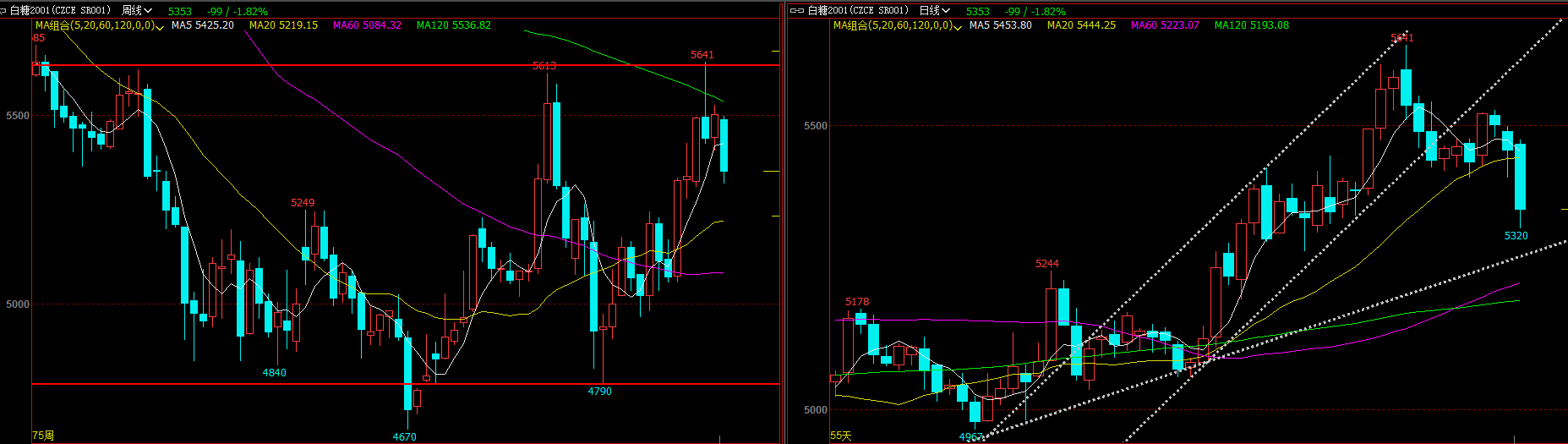 前言:今日糖價(jià)下跌,鄭糖主力合約下午收盤(pán)于5353,整天下跌104個(gè)點(diǎn),跌幅達(dá)1.91%。搜索市場(chǎng)消息,關(guān)于今日下跌更多的是對(duì)于國(guó)儲(chǔ)傳聞消息的猜測(cè),此前的一波走勢(shì)在預(yù)期庫(kù)存偏緊中大幅上漲,在預(yù)期糖價(jià)將在5800時(shí)國(guó)儲(chǔ)出庫(kù)傳聞中結(jié)束。目前糖價(jià)從5641高位回落至今日已回調(diào)300多個(gè)點(diǎn),那后期糖價(jià)在缺乏明確消息指引下是就此止跌企穩(wěn)還是繼續(xù)回調(diào)?筆者認(rèn)為......