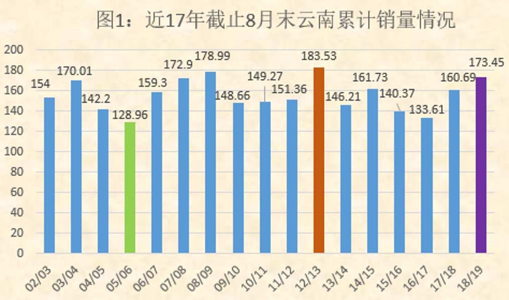 圖1所示,近17年截止8月末云南累計(jì)銷量最多的是2012/13榨季183.53萬噸,最少的是2005/06榨季128.96萬噸,2018/19榨季的173.45萬噸的銷售量在產(chǎn)量略增加的前提下,還能同比增加12.76萬噸,順價銷售“功不可沒”。