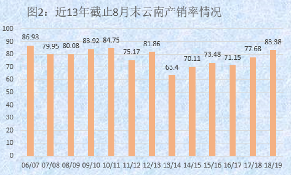 圖2所示,近13年截止8月末云南的產(chǎn)銷率最高的是2006/07榨季86.98%,最低的是63.4%,2018/19榨季的83.38%處于次高位,同比提升5.7%;由此也能看出本榨季以來云南糖企順價銷售后“成績”一直都是不錯的。