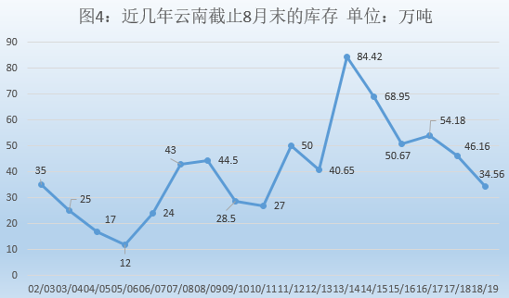 圖3所示,從2014/15榨季開始,8月末云南食糖工業(yè)庫存有逐漸減少的趨勢, 18/19榨季庫存降至34.56萬噸,創(chuàng)下近7個榨季以來的新低。