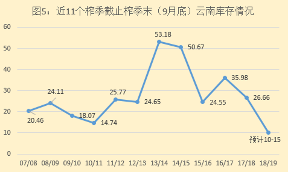 按照近11個榨季云南9月份的平均食糖銷量25萬噸算,截止榨季末(9月底)累計(jì)銷量為198萬噸,結(jié)轉(zhuǎn)庫存10-15萬噸左右。圖5所示,近十個截止榨季末(9月底)云南庫存情況,其中,最高值為13/14榨季的53.18萬噸,最低值可能就是18/19榨季的10-15萬噸。