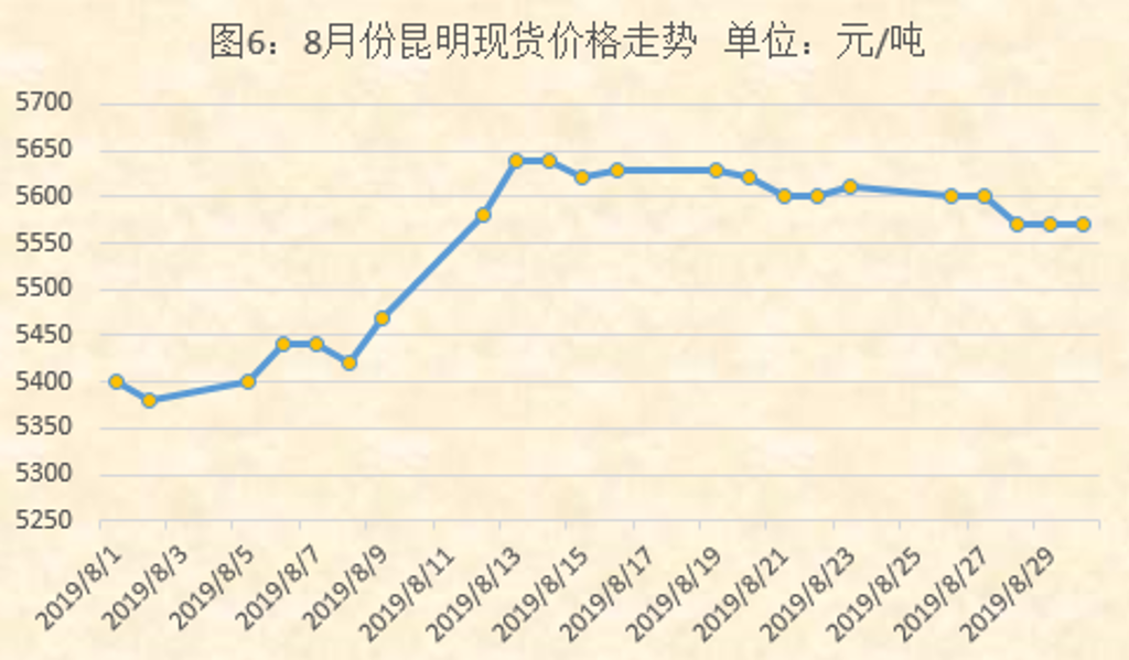 圖6所示,8月末昆明現(xiàn)貨價格為5570元/噸,同比上漲470元,環(huán)比上漲190元。最高價為5640元/噸,出現(xiàn)在8月13日。最低價為5380元/噸,出現(xiàn)在8月2日,與去年同期上漲日期相比基本吻合。價格波動區(qū)間在5400-5570元/噸,月內(nèi)波動幅度170元,大于上年同期80元的波幅,價格波動的速度快、但徘徊時間長,這也是8月后期銷量偏少的另一個原因吧。