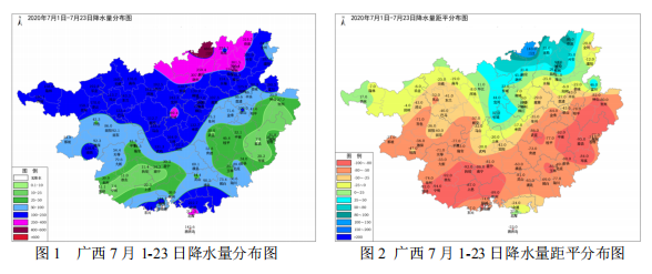一、前期天氣概況 繼 6 月份桂南、桂東大部降雨量偏少以來,7 月至今,我區桂南、 桂東大部降雨量繼續偏少,氣溫持續偏高。7 月 1 日~7 月 23 日,我區大 部地區氣溫偏高、降雨偏少(圖 1~圖 3),特別是桂南大部地區平均氣 溫比常年同期偏高 1.0~2.0℃,降雨量偏少 5~10 成,其中崇左、梧州、 賀州、貴港、欽州等市大部及南寧、玉林、百色、防城港等市部分地區 降水不足 50mm,較常年同期偏少 8 成以上;梧州、百色、崇左、貴港、 防城港等市部分地區日最高氣溫≥35℃的高溫日數超過 10 天,其中崇左、 梧州兩市部分地區超過 15 天,崇左最高達到 21 天,連續高溫日數大部 在 3~7 天,其中崇左最高達 15 天,過程極端最高氣溫也出現在崇左, 為 39.2℃。根據 7 月 23 日氣象干旱監測,全區共有 48 個縣發生不同程 度的氣象干旱,其中特旱 25 個,重旱 4 個,中旱 13 個,輕旱 6 個(圖 4)