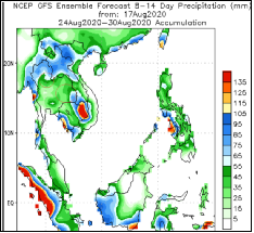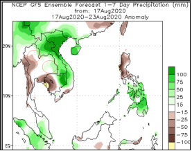 泰國計劃在9 月下旬發(fā)布2020/21榨季的甘蔗和糖產(chǎn)量估算。今年5月,初步預(yù)測甘蔗和糖的產(chǎn)量都將低于或等于2019/20 榨季的水平。根據(jù)泰國氣象部門的數(shù)據(jù),7月份主產(chǎn)區(qū)降雨低于平均水平,進入8月份,降雨明顯增多,但到了8月最后一周東北部產(chǎn)區(qū)降雨又將低于平均水平。從十月份開始,泰國北部和甘蔗主要生長的東北部地區(qū)的陣雨可能會開始減少。