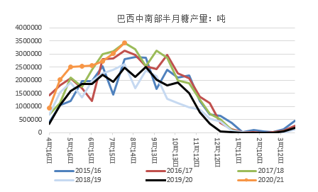 巴西正值生產(chǎn)旺季,直到10月份巴西糖仍然是全球主要的供應(yīng)糖源。最新報告顯示, 中南部有261家糖廠正在生產(chǎn),同比增加3家,收割進度55%。中南部地區(qū)7月下半月入榨甘蔗5047.8萬噸,較上半月提高8.5% ,同比提高1.2% ;甘蔗糖分為148.12 公斤/噸,較上半月提高4.2% , 同比提高4.9% ;產(chǎn)糖341.6萬噸,較上半月提高13%,同比增長37.7%,因天氣干燥,利于收割,提振甘蔗質(zhì)量,糖產(chǎn)量達(dá)到了歷史高點。甘蔗制糖比達(dá)47.94%,與上半月持平,同比提高11個百分點;產(chǎn)乙醇23.95億升,較上半月提高12.7% ,同比下降10.1%。20/21 榨季截至7月31日,中南部累計產(chǎn)糖1972.8萬噸,同比增長47.6%;甘蔗制糖比為46.9% ,同比提高11.65個百分點;累計產(chǎn)乙醇145.23 億升,同比下降6.6%。