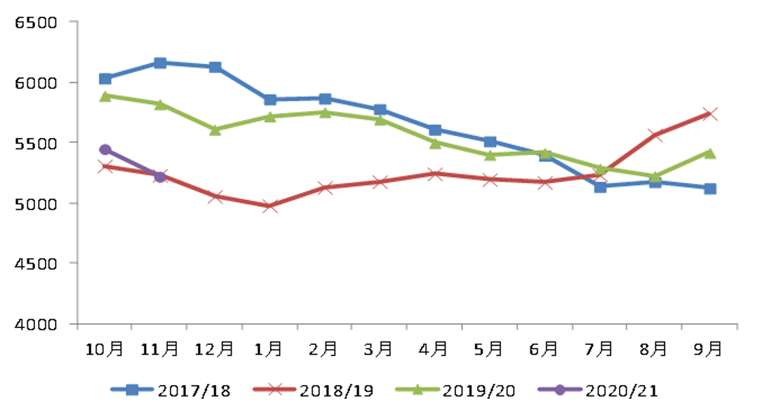 11月份,國內(nèi)糖價下跌,均價為每噸5219元,環(huán)比跌229元,跌幅4.2%;同比跌601元,跌幅10.3%。每日糖價走勢請看圖1。國內(nèi)糖價下跌的原因主要是:目前國內(nèi)食糖消費(fèi)市場處于相對淡季;開榨的甘蔗糖廠陸續(xù)增多,新糖上市逐步增加;進(jìn)口糖、糖漿對市場有較大的補(bǔ)充。