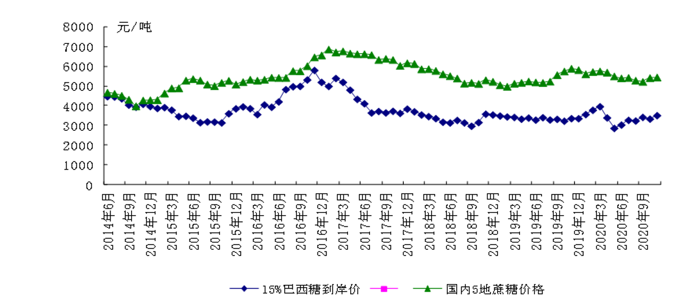 11月份,配額內(nèi)15%關(guān)稅的巴西食糖到岸稅后價每噸3781元,環(huán)比漲116元,漲幅3.2%,比國內(nèi)糖價低1438元,價差比上月縮小346元。而進(jìn)口配額外50%關(guān)稅的巴西食糖到岸稅后價每噸4826元,環(huán)比漲153元,漲幅3.3%,比國內(nèi)糖價低393元,價差比上月縮小382元。國內(nèi)外價差連續(xù)縮小的原因主要是:國際糖價小幅上漲而國內(nèi)糖價下跌。