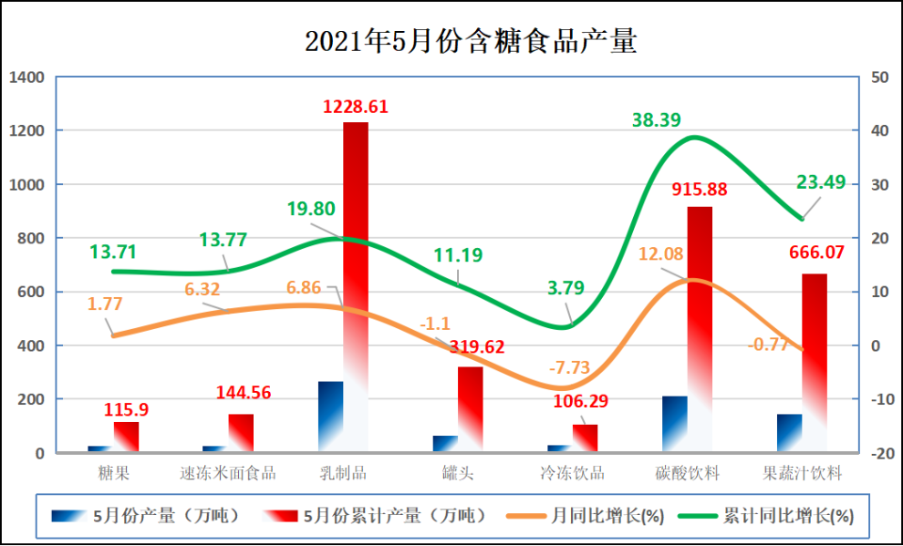 據國家相關統計部門數據,2021年5月份國內7類主要含糖食品累計產量同比均呈現上漲趨勢,上漲幅度在3.79%-38.39%之間。