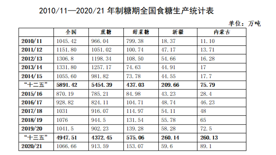 ——“南糖北移”遭遇糧食安全戰略阻擊,內蒙古和新疆難堪國家食糖安全大任。由于土地資源優勢,“十三五”以來,以內蒙古為代表的北方甜菜糖進入快速發展期,占全國食糖的比重快速提升,在業界形成“南糖北移”“新認識”。“十三五”時期,內蒙古累計產糖260.13萬噸,比“十二五”時期累計增長243.22%,占北方甜菜糖的比重達到45.24%,比“十二五”時期提高9.09個百分點。在內蒙古甜菜糖快速發展的帶動下,“十三五”時期北方甜菜糖累計產量575.06萬噸,比“十二五”時期累計增長31.58%,占全國同期食糖總產量的11.94%,比“十二五”時期提高4.52個百分點(詳見“2010/11—2020/21年制糖期全國食糖生產統計表”)。