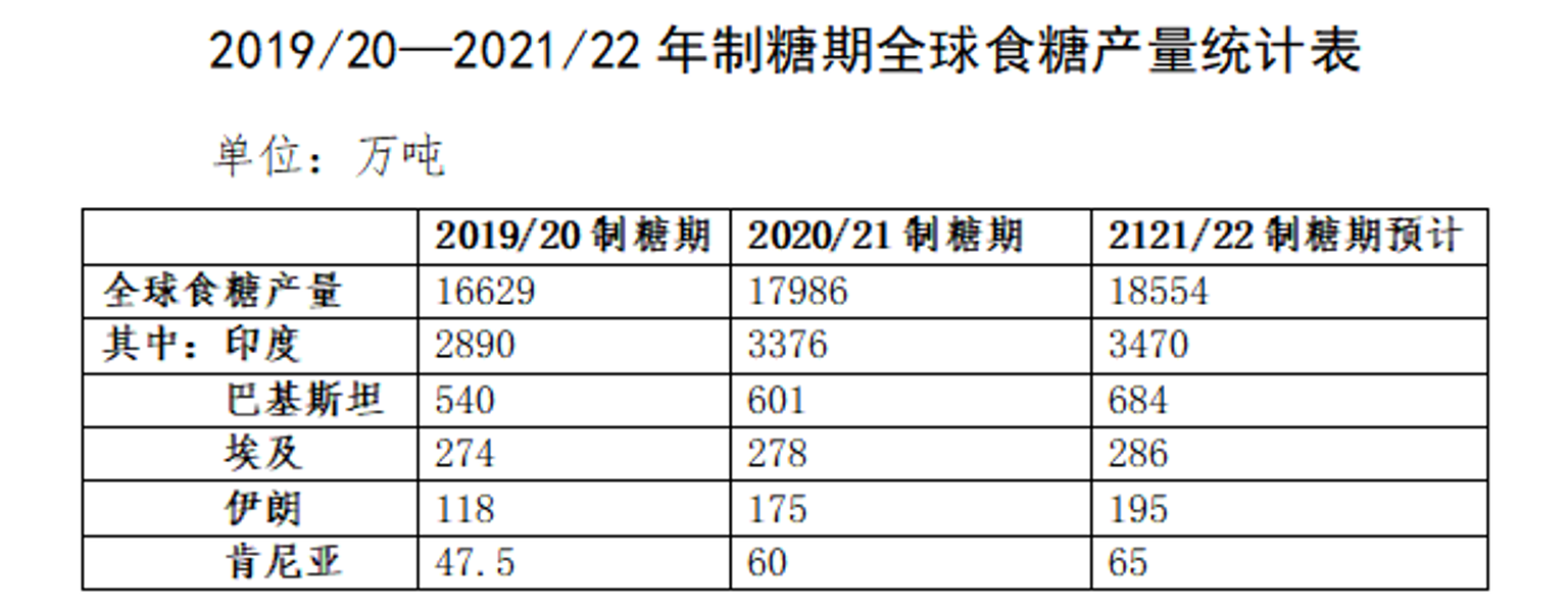 三是第二三世界國家糖業加快發展。糖業是市場充分競爭的傳統農產品加工業,其基本特征是占用土地資源多、市場風險大、梯度轉移明顯。近來年,在發展中、欠發達國家(地區)糖業快速發展的帶動下,全球食糖產量持續增長,預計到2024年前后,世界食糖市場將再次進入供大于求周期。2019/20年制糖期,全球食糖產量1.66億噸,2020/21年制糖期1.80億噸,預計2021/22年制糖期1.86億噸。其中增長較快的國家和地區主要有印度、埃及、伊朗、肯尼亞、巴基斯坦等國家(詳見“2019/20—2021/22年制糖期全球食糖產量統計表”)。