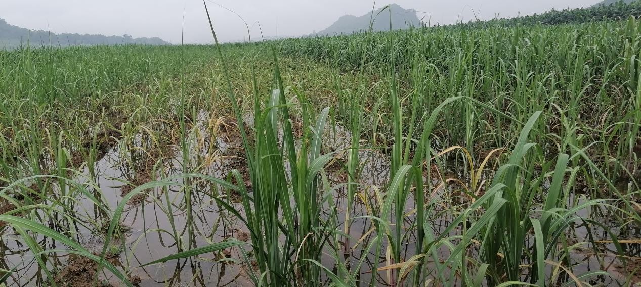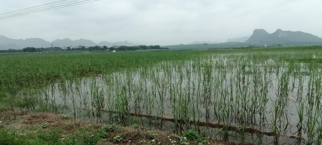 二、受災圖展。由于短時間內降雨量過大,加上5月份一直降雨不斷,土壤飽和,此次降雨造成了蔗區甘蔗遭受了不同程度水澇災害,造成甘蔗死亡、根變弱等,從而造成減產。低洼甘蔗地受水災情況系列圖片見下: