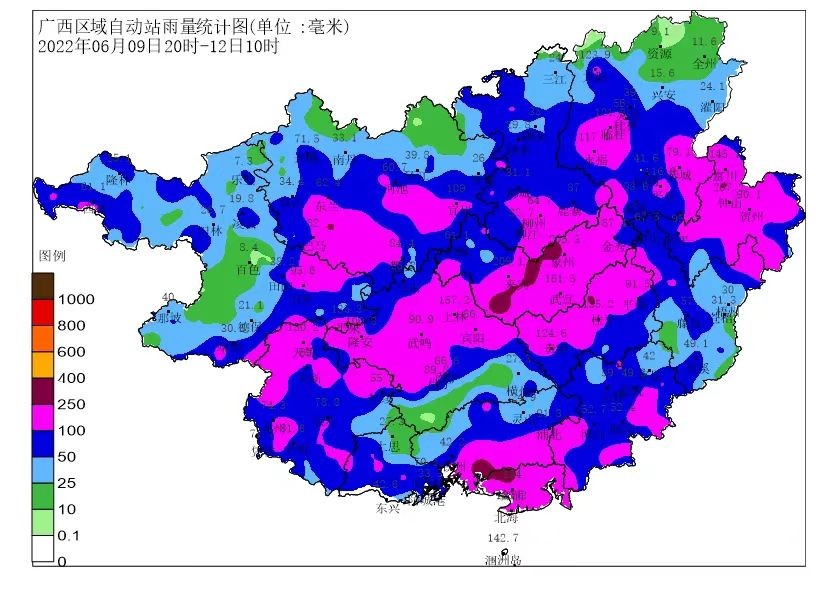 一、天氣情況。6月10-14日受低渦切變線和冷空氣共同影響,全區有一次持續性暴雨、局部大暴雨到特大暴雨并伴有雷暴大風等強對流天氣過程。根據甘蔗澇漬害監測預警模型,預計未來7天部分蔗區出現中度澇漬害和輕度澇漬害(見圖1),對甘蔗分蘗和生長發育有不利影響。據統計,6月9日20時至12日10時,超過250毫米有7市8縣11個鄉鎮,100-250毫米有14市78縣(區)398個鄉鎮,50-100毫米有14市100個縣(區)463個鄉鎮。