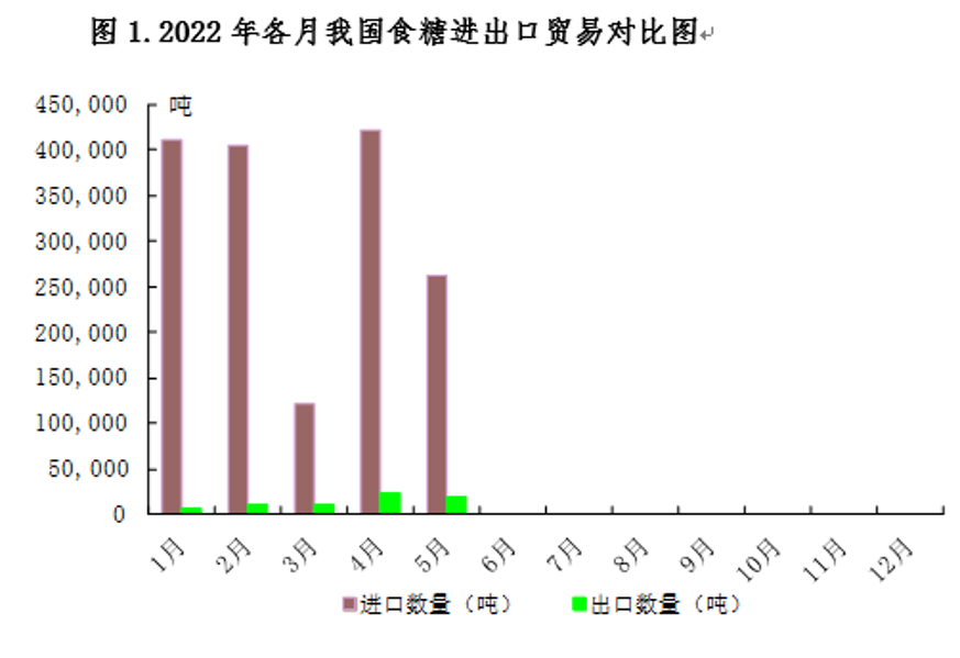 2022年1-5月我國進口食糖162.4萬噸,同比增長1.2%;出口食糖6.98萬噸,同比增長39.5%。1-5月進口食糖占2022年進口關稅配額的83.5%。2022年我國食糖進口配額仍為194.5萬噸。