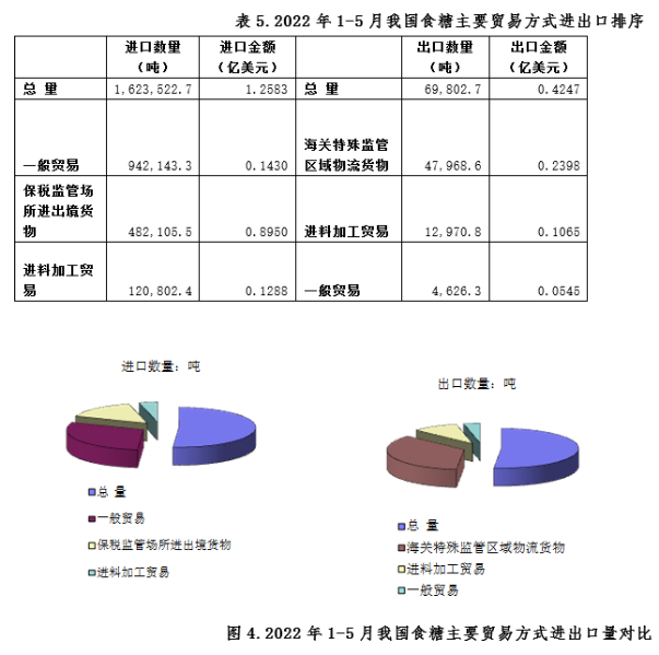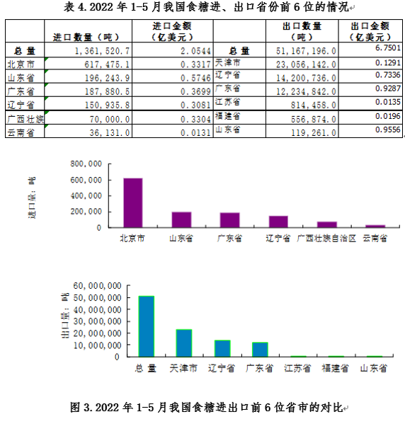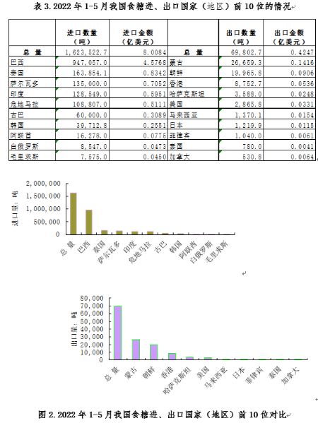 2022年1-5月,從進出口國別和地區看,我國食糖進口主要來自:巴西、泰國和薩爾瓦多;出口目的地主要是:蒙古、朝鮮和香港等國家和地區。
