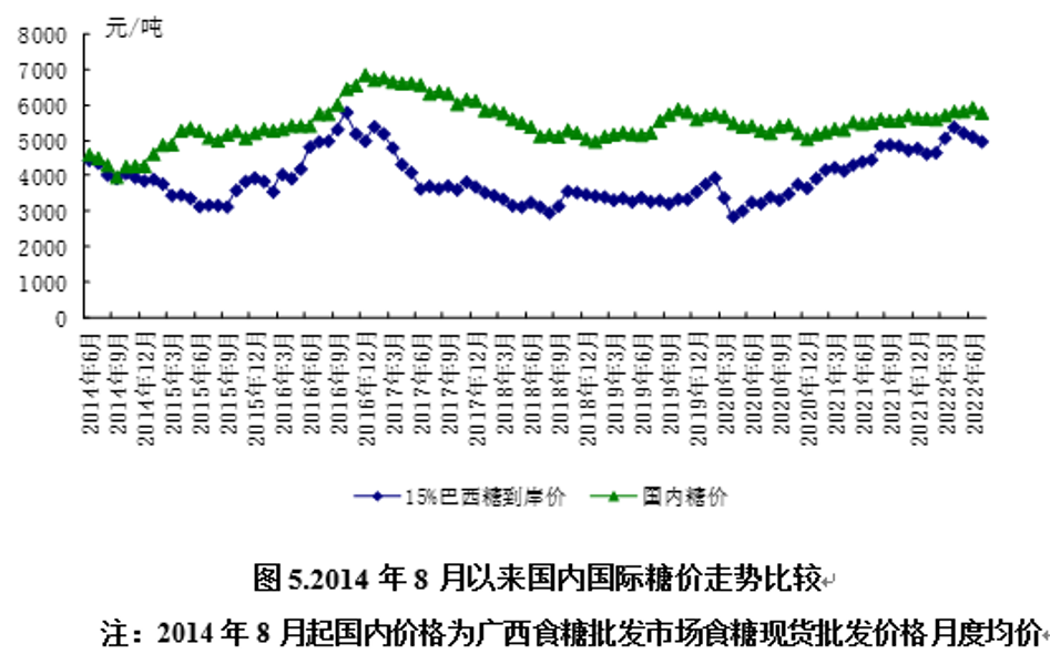 2.國內糖價為廣西食糖批發市場食糖現貨批發價格均價(2014年8月起)