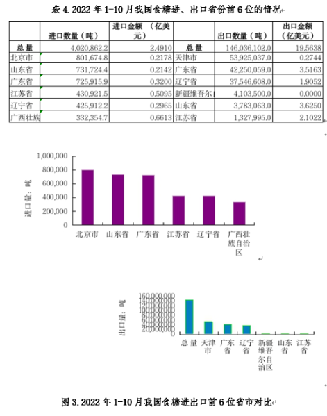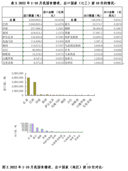 2022年1-10月,從進出口國別和地區看,我國食糖進口主要來自:巴西、印度和泰國;出口目的地主要是:蒙古、朝鮮和香港等國家和地區。