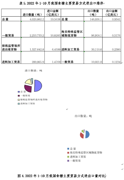 2022年1-10月我國進口食糖402.2萬噸,同比下降13.3%;出口食糖14.6萬噸,同比增長44.9%。1-10月進口食糖占2022年進口關稅配額的206.8%。2022年我國食糖進口配額仍為194.5萬噸。